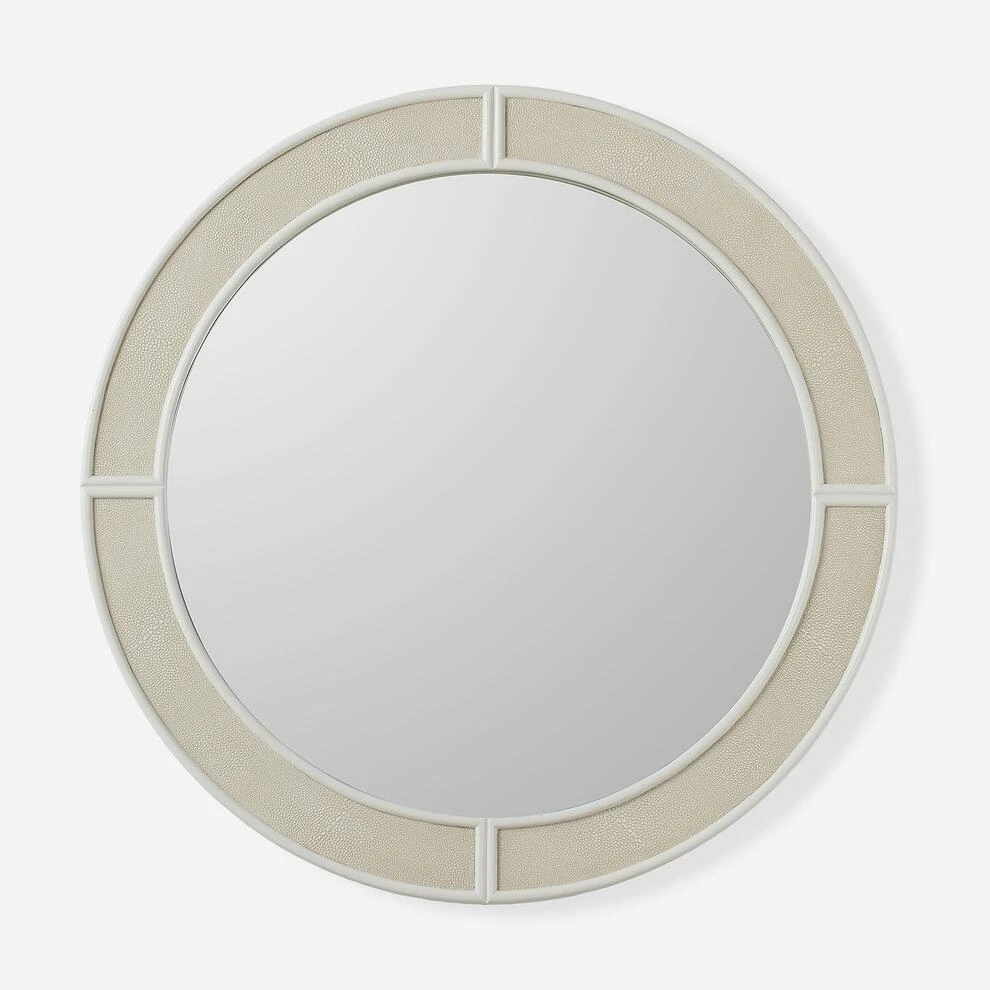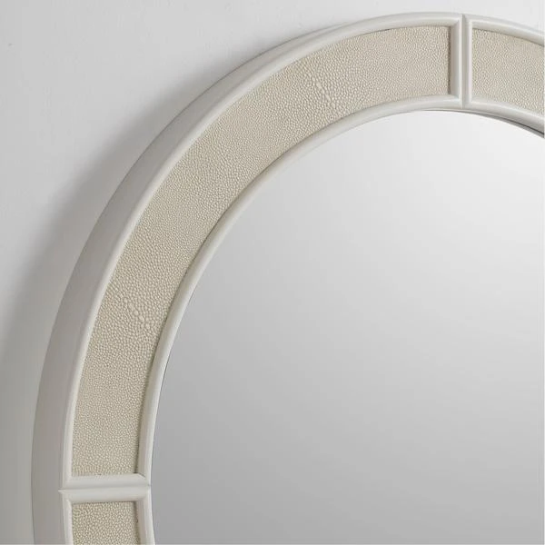 A large round mirror set in a faux shagreen frame in soft off