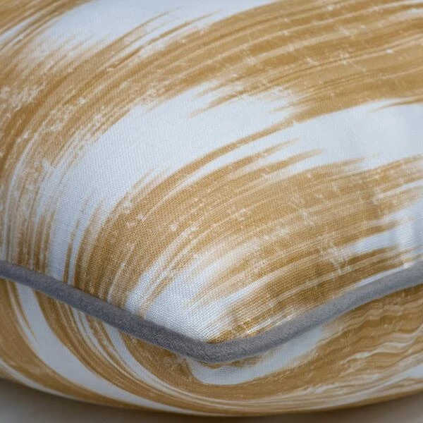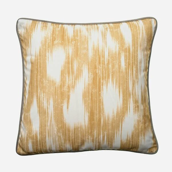 cushion features an ikat pattern in yellow and white hues with