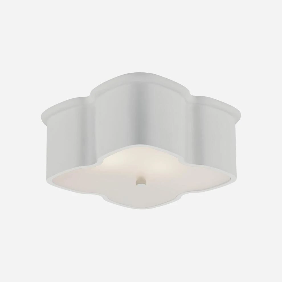 A flush ceiling light in a curved, clover shape in matte white