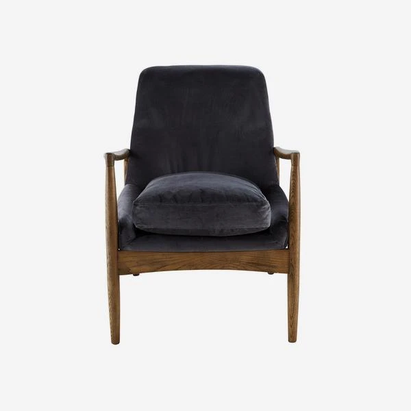 A sumptuous grey velvet chair in a rich dark wooden frame.
