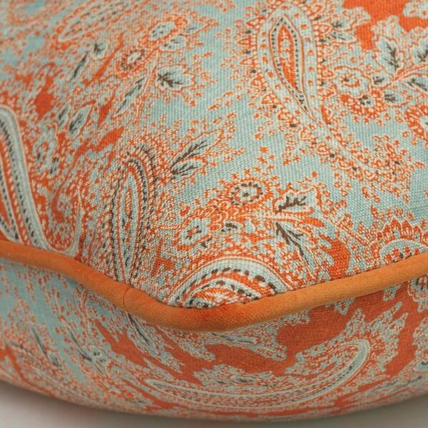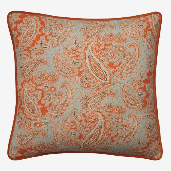 and fiery orange, this plump feather-filled cushion uses , our bespoke paisley print inspired by flowing florals and