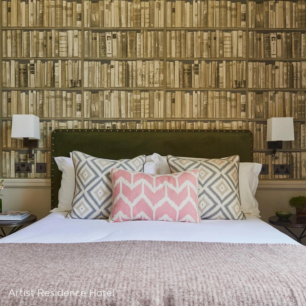 A clever bookcase design with painterly book spine detailing in