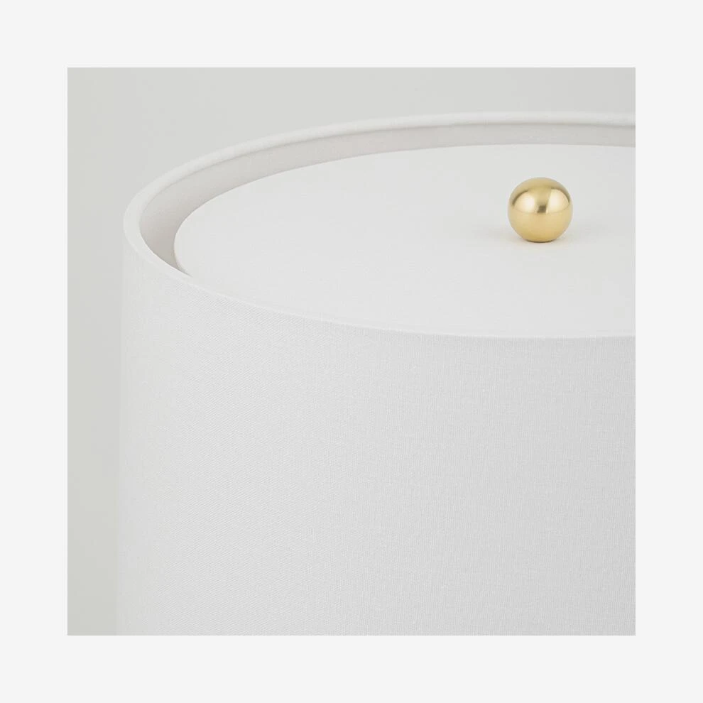 the Belgian linen drum shade. Aged brass accents add just the right