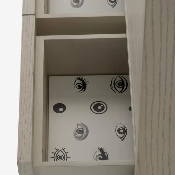 ash finish and simple brass circle design on it’s push catch doors.