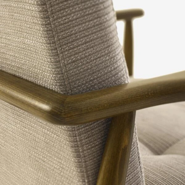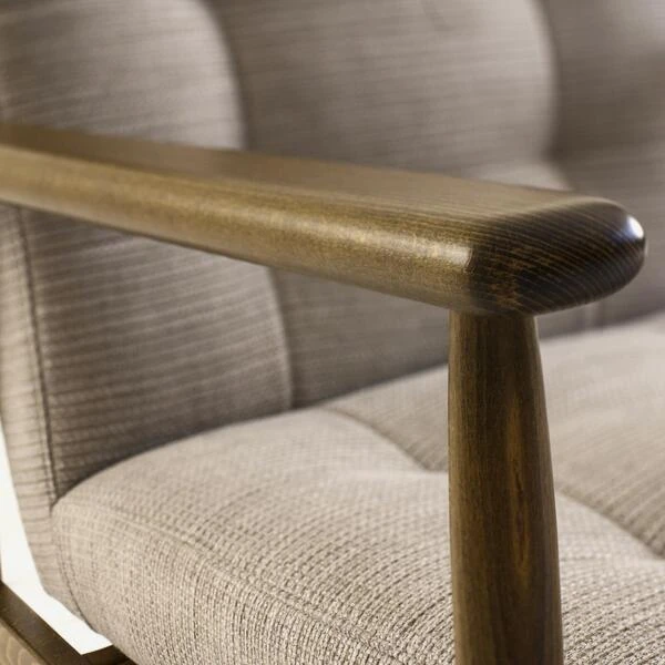 graining. The comfy padded seat and back is upholstered in , a rustic open weave with linen chenille in a soft grey