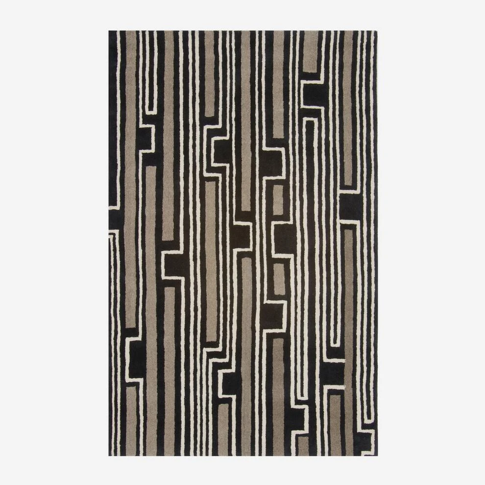 A striking rug featuring black, taupe and cream geometric